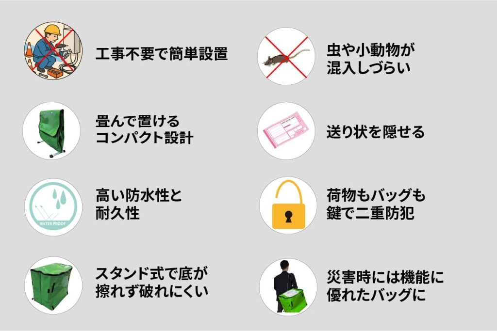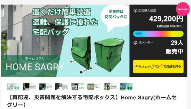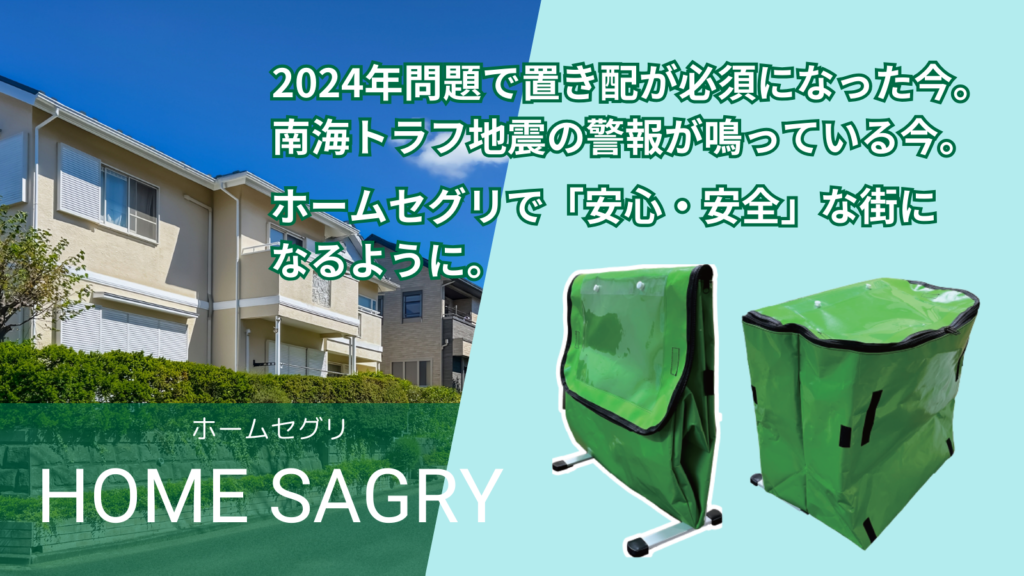 緊急時は防災バッグに!宅配バッグ「ホームセグリー」で安全で便利な生活を。 置き配、災害問題にこれひとつ。 2024年から置き配が必須になりました。今では置き配を標準化し、手渡しの配達に手数料をかけるという施策を国が考えています。しかし、置き配した荷物がカラスに荒らされたり、盗難されたり、荷物の送り状から個人情報が漏洩してしまったりなど「安全面」でトラブルが相次いでいます。 宅配ボックスの設置には工事が必要となるため費用がかかり、設置が困難なケースも・・・。 Home Sagry(ホームセグリー)が置き配トラブルを解決します! 脅威の耐久性と防水性を実現 ホームセグリーには、建設現場の養生シートやテントなど、野外で使われることが多い「ターポリン」という素材を使用。耐久性と防水性に優れ、悪天候時に外に置いても心配不要です。また、縫い目がほとんどない構造をしているので隙間から水や害虫が入り込むリスクも防いでいます。 ※防水性はファスナー部分を除きます 圧倒的な「安全性」と「利便性」 盗難、異物混入、雨被害などのトラブルから荷物を守り、工事が不要でコンパクトに畳んでおくことができます。 さらにHome Sagry は、防犯だけでなく災害時にも使えます! 今年2024の1月1日に石川県能登地方で大きな地震がありました。過去には東日本大震災、阪神淡路大震災もあり、多くの人が避難生活を余儀なくされました。そしてあと30年の間に70%以上の確率で首都直下地震が起こるとも想定されています。日本ではいつ大きな災害が起こるかわからず、常に準備が必要になってきます。 ホームセグリーは「災害バッグ」としても機能し、災害があったときにホームセグリーに荷物を詰め込んで運ぶことができます。 今の日本の二大問題と言っても過言ではない、置き配と災害問題。 「Home Sagry」は、リーズナブルで防犯、防災、防水力に優れ、感染防止にもなる置き配が安全にできます。また、ワイヤーをまとめて肩にかけることで、災害時に大事な物を運ぶ「非常用バック」としての機能もあります。 ホームセグリは多くの方が置き配と災害トラブルの対策に導入しやすいものであると信じております。 Makuakeで成功した商品なので、品質は保証します! ホームセグリは2024年に応援購入サービスMakuakeにて成功した製品です。 様々ある宅ボックスは、ものによって壊れやすくかったりなど品質が伴っていないケースが多いです。 Makuakeで審査が通り実際にプロジェクトが達成されたホームセグリは品質を保証いたします。 製品仕様 サイズ巾436mm×奥行298mm×高430mm 収納容積56L 主材質カラ-タ-ポリン カラーライトグリーン ※300個以上のご注文で、お好きなカラー可 重量約1kg 施開錠南京錠による手操作 今だけ特別価格でご提供しています! このページからご購入いただいた方限定30名の方だけに、定価19800円のところ特別に50%引きの9,900円でご提供します! ぜひこれからのために置き配対策をしていきましょう! ご購入はこちら